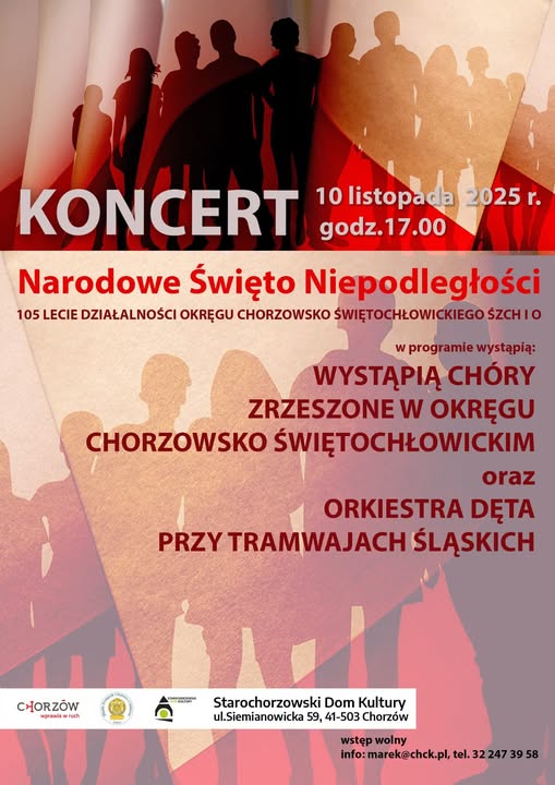 Co roku z okazji Święta Niepodległości 11 listopada Okręg Chorzowsko - Świętochłowicki Śląskiego Związku Chórów i Orkiestr organizuje koncert patriotyczny, w którym udział biorą zaproszone chóry zrzeszone w tymże Okręgu. Zazwyczaj wspomniany koncert ma miejsce właśnie w dzień Święta, lecz w tym roku ze względu na istotne dla lokalnego ruchu śpiewaczego wydarzenia zaistniała konieczność zmiany daty na 10 listopada. Powody niezwykle istotne: 10 listopada Okręg Chorzowsko - Świętochłowicki świętował swój jubileusz 105-lecia, a z kolei 11 listopada Śląski Związek Chórów i Orkiestr obchodził 115 urodziny w sali koncertowej katowickiego NOSPRu!